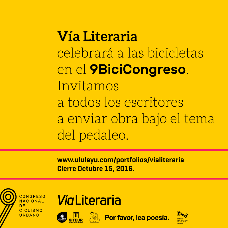 #VíaLiteraria celebrará a la bicicleta en el marco de 9 Congreso Nacional de Ciclismo Urbano que se llevará a cabo en Guadalajara, MX, del 18 al 20 de noviembre. #Ululayu pondrá versos en el tren como parte de la movilidad multimodal que fomentamos. Todos los escritores están invitados a participar.